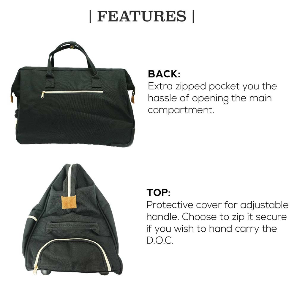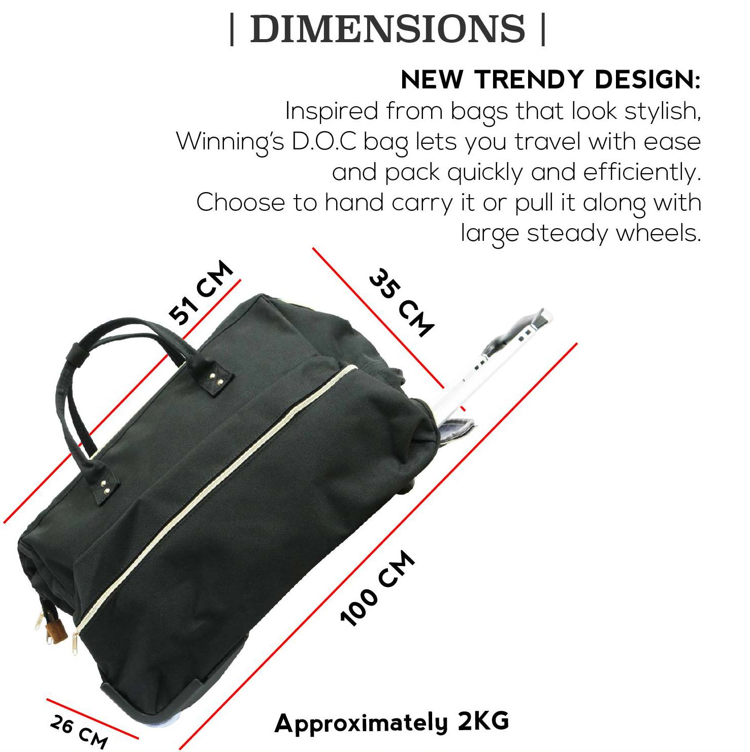 Introducing the new Winning trolley duffel bag (D.O.C)! The fabric is high density and tear resistance which is made of heavy duty polyester material. It is designed with smooth and silent spinner wheels have been carefully positioned on the base corners to keep the case perfectly balanced. The telescopic ergonomic handle for a comfortable grip can be retracted fully and hidden within a compartment.